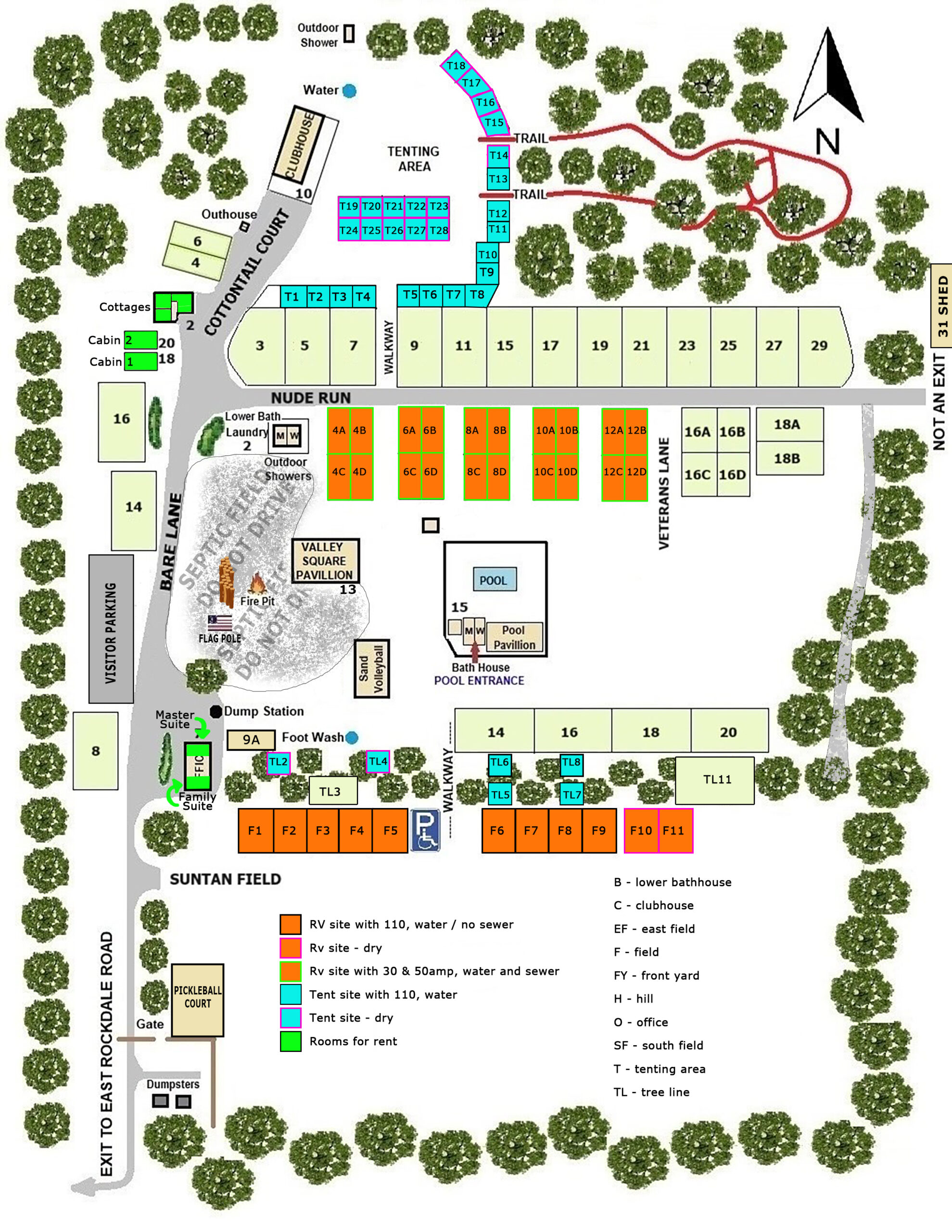 - Cabins: We have 2 cabins available. They are located where Bare Ln and Cottontail Ct intersect (buildings #18 & #20) and do not include a private bathroom.